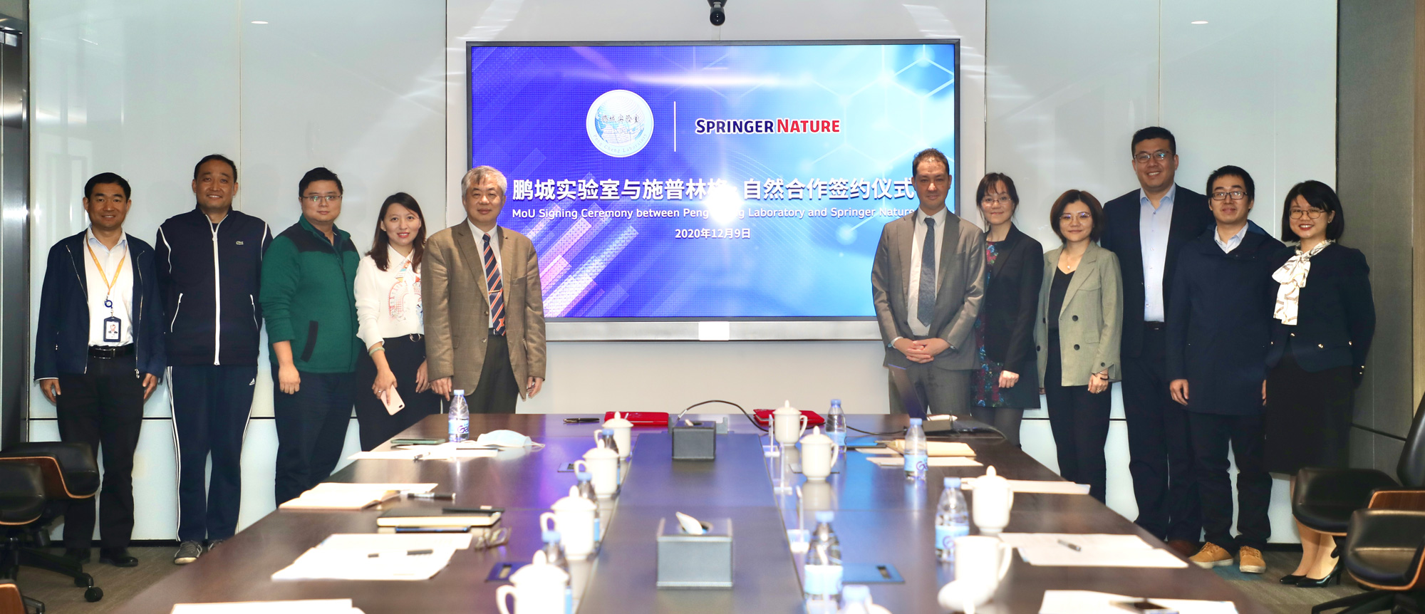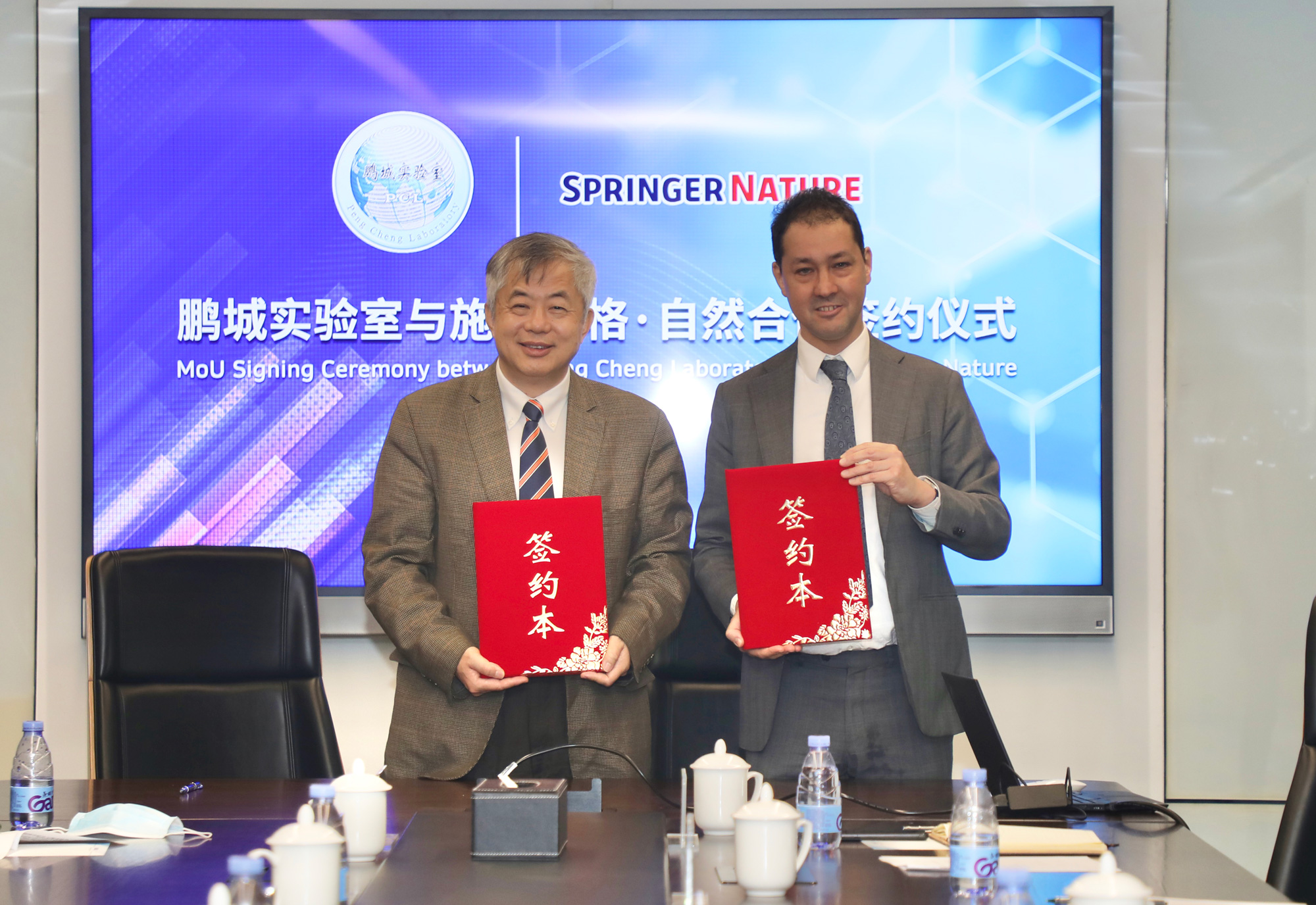 2020年12月9日,鹏城实验室与施普林格·自然举行合作签约仪式,实验室副主任陈长汶、施普林格·自然大中华区总裁安诺杰(Arnout Jacobs)代表各自单位签署双方合作谅解备忘录。施普林格·自然大中华区政府与学术事物副总裁及自然科研系列执行主编杨晓虹、期刊出版总监李娴,鹏城实验室国际合作办、科研发展部及研究中心相关负责人等共同见证了本次签约仪式。