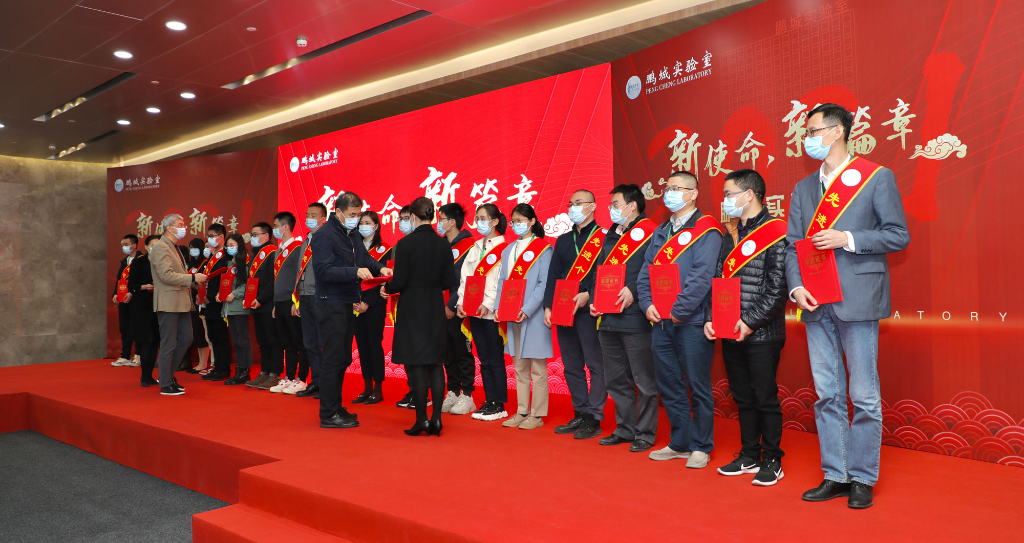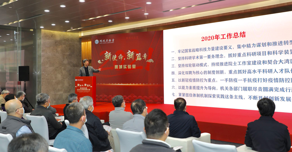 2021年1月20日,鹏城实验室召开2020年终总结大会。大会以“新使命,新篇章”为主题,鹏城实验室主任、中国工程院院士高文作了《乘势而上 勇攀高峰,努力推动新阶段发展开好局起好步》的讲话,实验室领导邹鹏教授作了实验室2020年度工作报告。中国工程院院士方滨兴、丁文华、于全,广东省科技厅省实验室建设与重大基础研究推进工作小组副组长温则伟、深圳市科创委副主任钟海、深圳市南山区副区长练聪等出席会议。大会按照疫情防控要求设主会场和分会场,实验室领导与员工代表在主会场参加会议,其他人员在分会场参加会议。