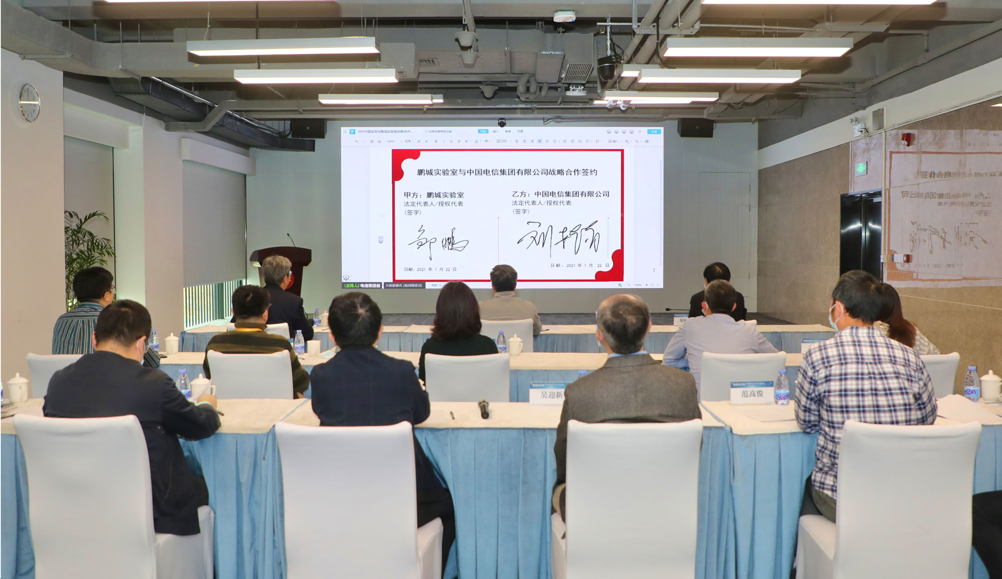 2021年1月22日,鹏城实验室与中国电信集团有限公司战略合作签约仪式在深圳和北京两地通过远程视频会议形式召开。鹏城实验室主任、中国工程院院士高文,中国电信集团董事长柯瑞文等出席仪式。鹏城实验室领导邹鹏与中国电信集团副总经理刘桂清代表双方签约。