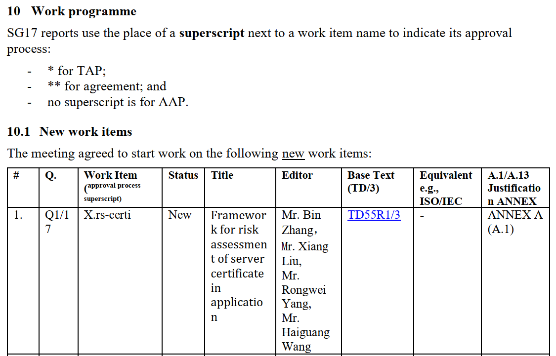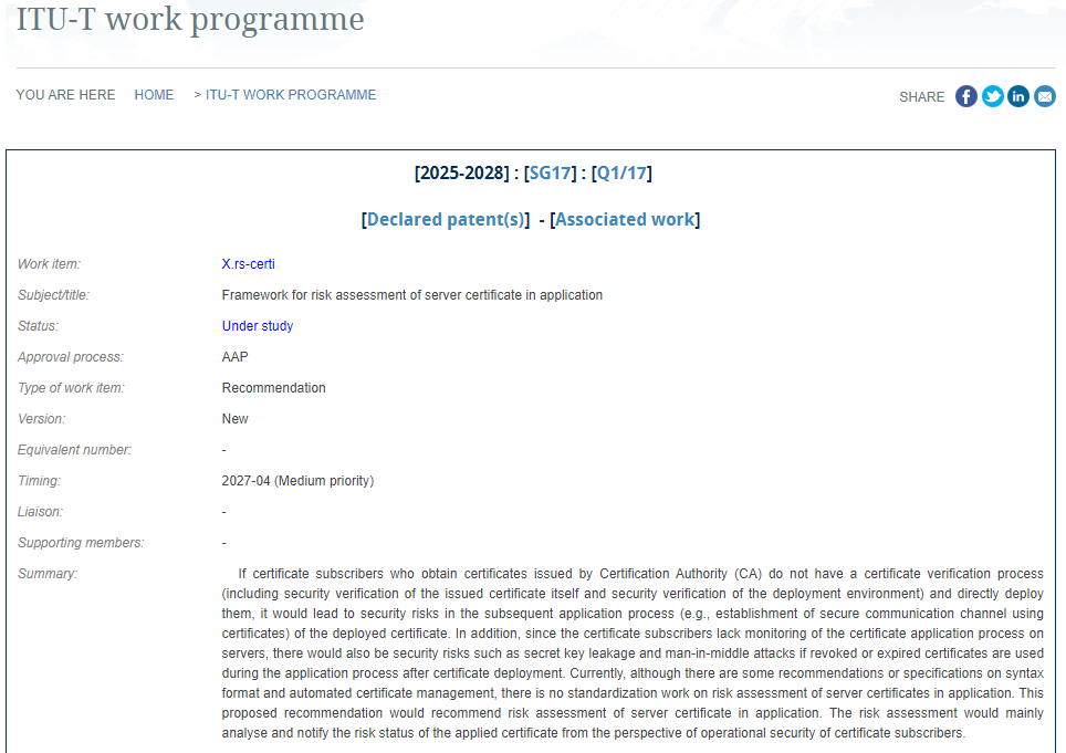 2025年4月8日至17日,国际电信联盟电信标准化部门第十七研究组(ITU-T SG17)在瑞士日内瓦召开全体会议,由鹏城实验室牵头提出的X.rs-certi: Framework for risk assessment of server certificate in application(数字证书在服务器应用中的风险评估框架,下称“X.rs-certi标准”)国际标准立项建议获批通过。